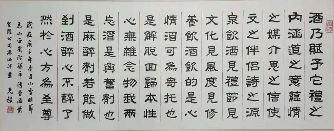 汾陽(yáng)市清香酒業(yè)有限公司座落在中華名酒第一村---杏花村申明亭路9號(hào)。《汾酒曲》中記載,申明亭畔新淘井,水重依稀亞蟹黃 ,注解說(shuō):申明亭井水絕佳,以之釀酒,斤兩獨(dú)重。明末愛(ài)國(guó)詩(shī)人、書(shū)法家和醫(yī)學(xué)家傅山先生,曾為申明亭古井親筆題寫(xiě)了得造花香四個(gè)大字,說(shuō)明杏花井泉得天獨(dú)厚,釀出的美酒如同花香沁人心脾。 汾陽(yáng)市清香酒業(yè)有限公司出品的清香型高端白酒用的是優(yōu)質(zhì)高粱、大麥和豌豆等上等原料和申明亭地下礦泉水,再加上杏花村土壤和空氣中獨(dú)有的菌群,在杏花村釀酒匠人的傳統(tǒng)工藝下精心釀造:清蒸二次清,固態(tài)地缸分離發(fā)酵,清字當(dāng)頭,一清到底,釀出的酒:酒液晶亮、清香幽雅、醇凈柔和、回甜爽口、飲后余香,在國(guó)內(nèi)外享有盛譽(yù)。